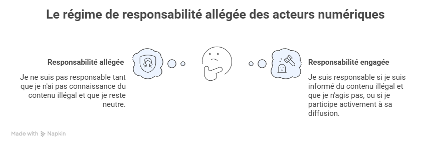 En imposant aux fournisseurs d’accès à internet et aux hébergeurs de conserver les données permettant d’identifier les auteurs de contenus mis en ligne, le législateur a établi la contrepartie essentielle du régime de responsabilité limitée dont bénéficient les intermédiaires techniques. Ce régime repose sur une exonération de responsabilité conditionnelle, fondée sur l’absence de connaissance préalable des contenus et l’obligation d’agir promptement dès notification, excluant toute obligation générale de surveillance. La conservation des données constitue dès lors la contrepartie procédurale de cette neutralité, en permettant l’identification a posteriori des auteurs d’atteintes sans transformer les intermédiaires en acteurs de contrôle.