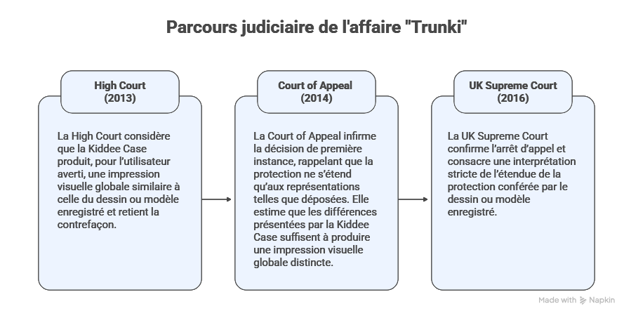 Créée au milieu des années 2000, la société britannique Magmatic Ltd commercialisait la valise pour enfants « Trunki », conçue comme un bagage cabine que les enfants peuvent chevaucher. Le succès commercial du produit reposait largement sur son apparence : une coque rigide aux lignes arrondies, intégrant des éléments saillants évoquant les cornes d’un animal stylisé, combinée à une surface lisse et épurée.