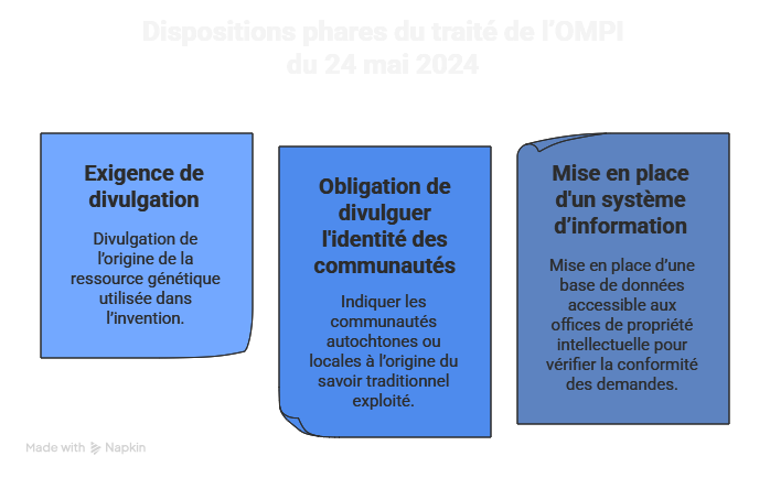 Après plus de vingt ans de discussion, l’OMPI a adopté le 24 mai 2024 le premier traité international visant explicitement à encadrer la relation entre propriété intellectuelle, ressources génétiques et savoirs traditionnels associés. Parmi ses dispositions phares :