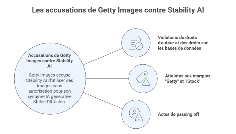 Getty Images reprochait à Stability AI d’avoir utilisé, sans autorisation, des images issues de ses bases de données pour entraîner son modèle, et d’avoir généré des images synthétiques reproduisant ses filigranes « Getty Images » ou « iStock ».