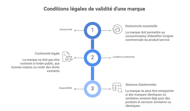 La distinctivité est la condition première : la marque doit permettre au consommateur d’identifier l’origine commerciale d’un produit ou service. Elle ne doit pas être descriptive, générique ou simplement fonctionnelle.