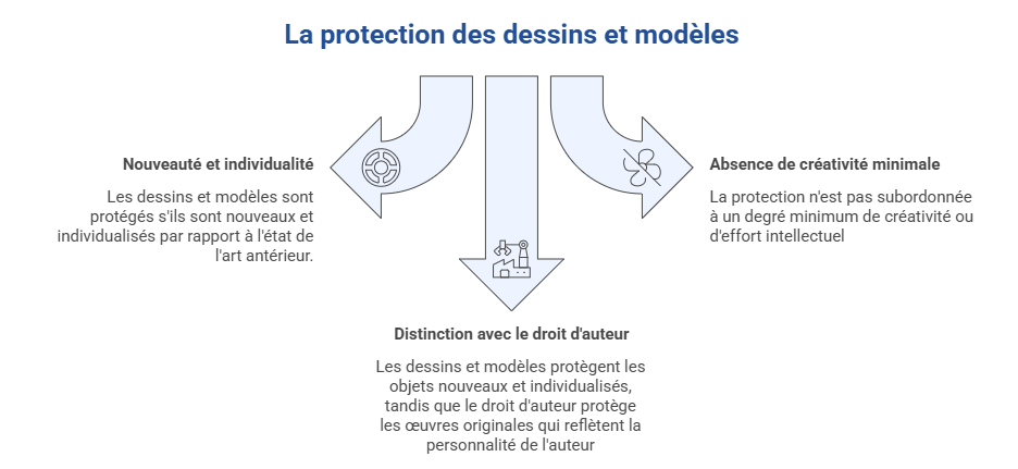 Elle distingue clairement le droit des dessins et modèles du droit d’auteur. Alors que ce dernier protège des « œuvres » originales reflétant la personnalité de leur auteur, le régime des dessins et modèles vise des « objets nouveaux et individualisés », présentant souvent un caractère utilitaire et destinés à une production de masse.