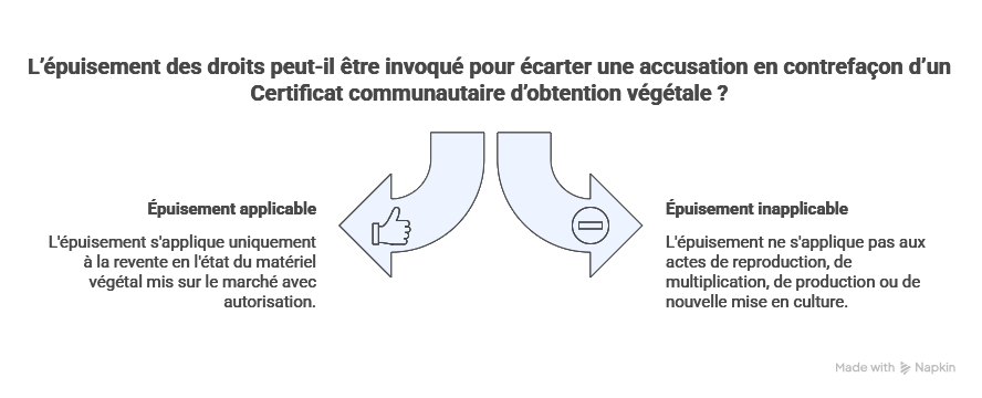 En revanche, l’épuisement ne s’étend jamais aux actes de reproduction, de multiplication, de production ou de nouvelle mise en culture du matériel protégé. Ainsi, la mise en circulation légale d’un plant ou d’un greffon n’autorise pas sa propagation ultérieure sans licence. L’épuisement ne peut donc, en principe, être invoqué pour justifier de tels actes.