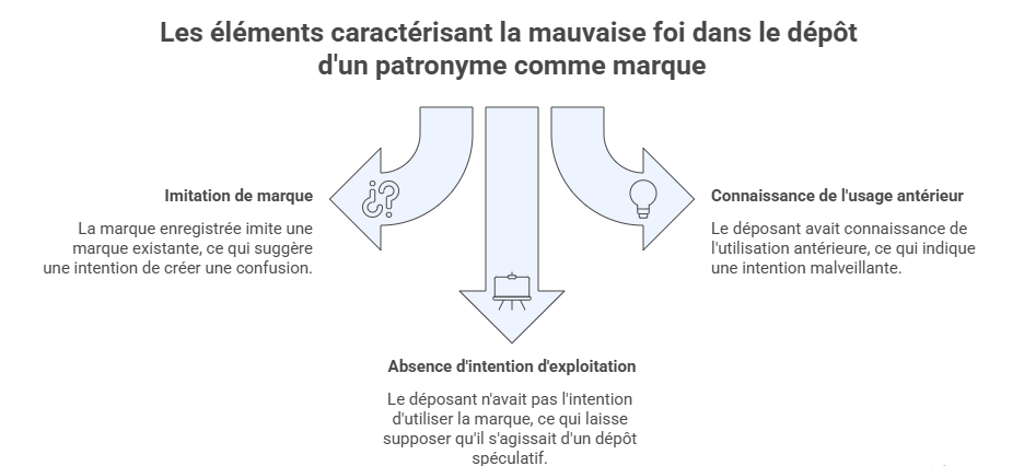 Toutefois, cette faculté peut également être utilisée de manière opportuniste. Dans certains cas, le dépôt d’un patronyme vise moins à protéger une activité qu’à bloquer l’usage du nom par un tiers ou à capter la réputation associée à ce nom. C’est précisément dans ce contexte que la notion de mauvaise foi joue un rôle central.