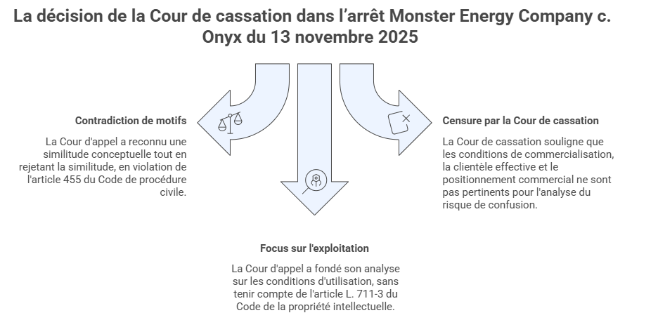 Dans l’arrêt Monster Energy Company c. Onyx du 13 novembre 2025 (n° 23-11.522), la Cour de cassation réaffirme avec netteté une règle directrice du droit français des marques : le risque de confusion s’apprécie au regard des signes tels que déposés et des produits ou services tels que désignés dans les enregistrements ou demandes d’enregistrement, sans tenir compte des conditions concrètes d’exploitation sur le marché.