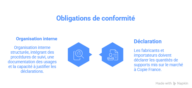 Elle implique plusieurs exigences, au premier rang desquelles figurent une identification précise des supports concernés, une déclaration périodique fiable et cohérente, ainsi qu’une traçabilité rigoureuse des volumes commercialisés, permettant de justifier à tout moment les données transmises aux organismes compétents.