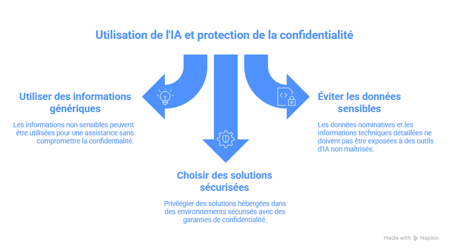 Il convient de limiter l’IA aux tâches non sensibles, de ne jamais y intégrer d’éléments identifiants ou stratégiques, et de privilégier des solutions sécurisées avec des garanties contractuelles fortes sur la confidentialité et la non-réutilisation des données.