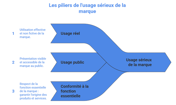 Un usage sérieux implique que l’usage doit être réel, public, et conforme à la fonction essentielle de la marque : garantir l’origine des produits ou services. La preuve peut être apportée par tout moyen, à condition qu’elle révèle une exploitation authentique et suffisamment significative, et non une utilisation de pure forme.