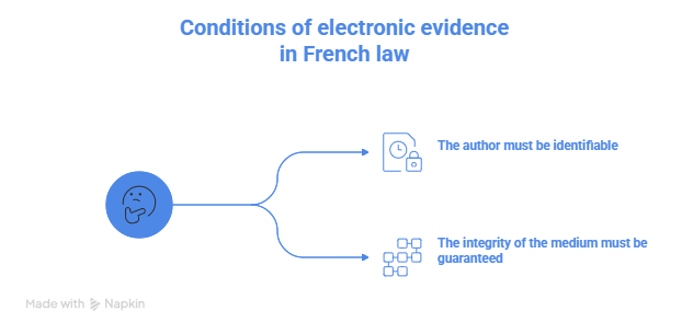 Under French law, the principle of freedom of evidence prevails. However, in matters where literal evidence is possible (including copyright), a minimum level of formality is required. Article 1358 of the French Civil Code provides that electronic documents are admissible as evidence in the same way as paper documents, provided that the author is identifiable and the integrity of the medium used is guaranteed.