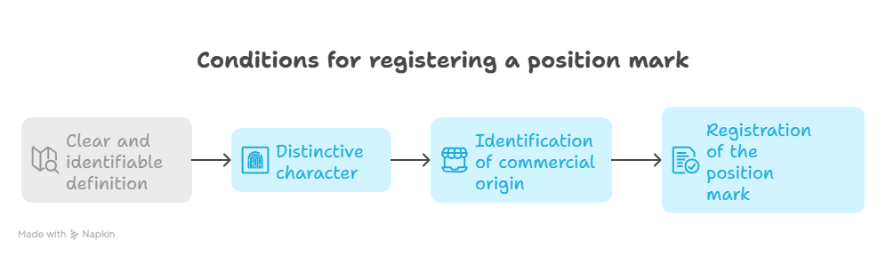 A position mark protects the specific way in which a sign is affixed to a product, rather than the sign itself. It is therefore distinct from figurative or three-dimensional marks.