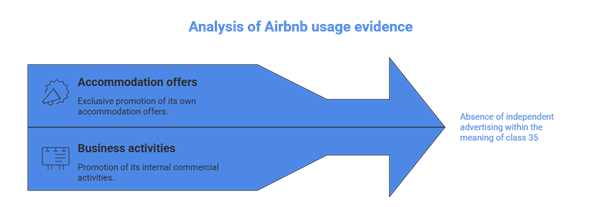 Following an appeal filed by Airbnb, the EUIPO Board of Appeal confirmed the revocation for class 35, finding that the evidence provided (promotional materials, marketing campaigns, website excerpts) related exclusively to the company’s internal activities and not to the provision of advertising services to third parties.