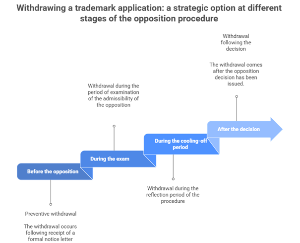 Opposition is based on the argument that the registration of the new trademark would infringe existing rights, in particular due to a likelihood of confusion, or the reputation or renown of the earlier trademark. In this context, the total or partial withdrawal of the contested application is often regarded by trademark offices as a priority solution, as it directly alters the subject matter of the dispute.