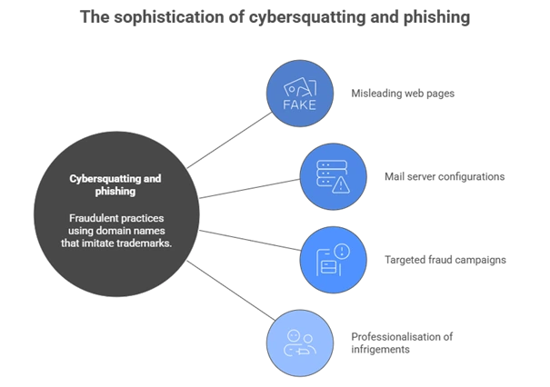 These figures confirm a continued intensification of cybersquatting, phishing, and identity theft practices, involving domain names that imitate well-known trademarks or distinctive corporate signs. Such practices are frequently accompanied by: