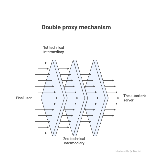 The double proxy is based on the successive interposition of several distinct technical intermediaries between the end user and the server effectively controlled by the attacker. In practice, the disputed domain name points to a first proxy, often operated by a CDN or reverse proxy provider, which then redirects to a second intermediary before reaching the final infrastructure.