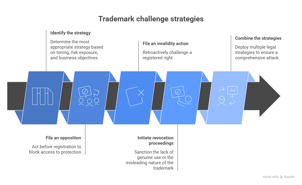 The choice between opposition, invalidity and revocation is not merely a procedural preference ; it forms part of a broader strategic approach that takes into account timing, legal risk exposure and underlying business objectives.
