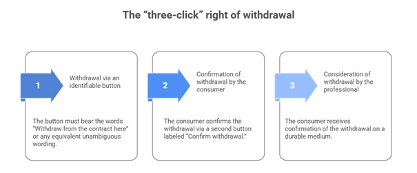 Consumer law is undergoing a major development with the introduction of a new mechanism: the “three-click” right of withdrawal for contracts concluded online within the European Union. Stemming from Directive (EU) 2023/2673, which amends Directive 2011/83 on consumer rights, this reform requires professionals to fundamentally rethink their digital interfaces, customer journeys and internal compliance processes.