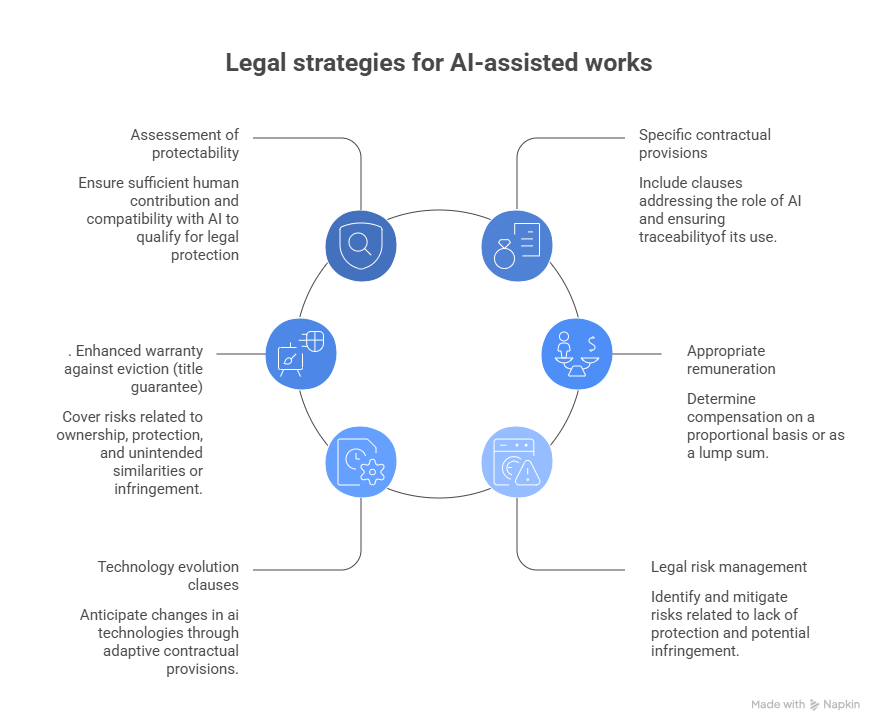 An AI-assisted work may be secured and assigned, provided that a rigorous approach is implemented, structured around legal qualification, proof of the creative process, and enhanced contractual safeguards.